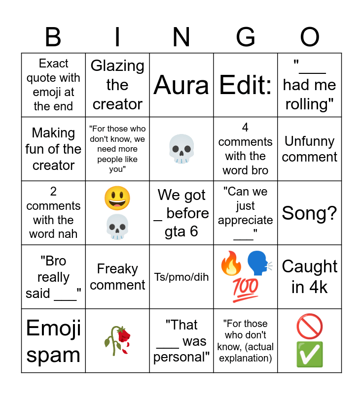 This bingo card has a free space and 24 words: Freaky comment, 🥀, 💀, Emoji spam, "___ had me rolling", Exact quote with emoji at the end, Making fun of the creator, Glazing the creator, "Can we just appreciate ___", Ts/pmo/dih, 4 comments with the word bro, 2 comments with the word nah, 🔥🗣💯, Caught in 4k, "For those who don't know, we need more people like you", "For those who don't know, (actual explanation), Song?, Aura, Unfunny comment, 😃💀, 🚫✅, "Bro really said ___", Edit: and "That ___ was personal".
