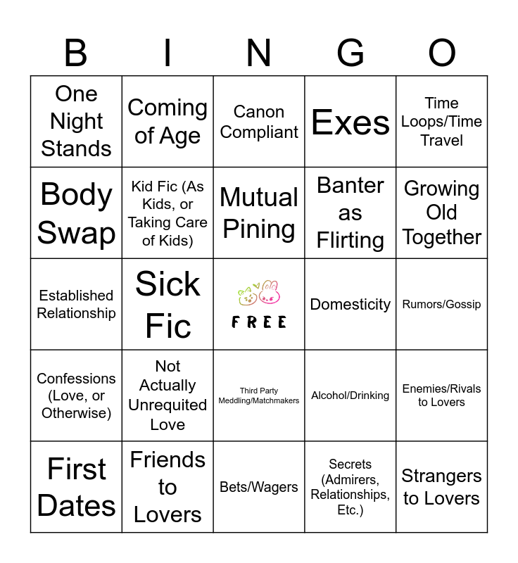This bingo card has a free space and 27 words: Alcohol/Drinking, And They Were Roommates, Banter as Flirting, Bets/Wagers, Body Swap, Canon Compliant, Coming of Age, Confessions (Love, or Otherwise), Domesticity, Enemies/Rivals to Lovers, Established Relationship, Exes, First Dates, Friends to Lovers, Growing Old Together, Hurt/Comfort, Kid Fic (As Kids, or Taking Care of Kids), Mutual Pining, Not Actually Unrequited Love, One Night Stands, Rumors/Gossip, Secrets (Admirers, Relationships, Etc.), Sick Fic, Strangers to Lovers, Third Party Meddling/Matchmakers, Time Loops/Time Travel and Truth or Dare (and Other Similar Games).