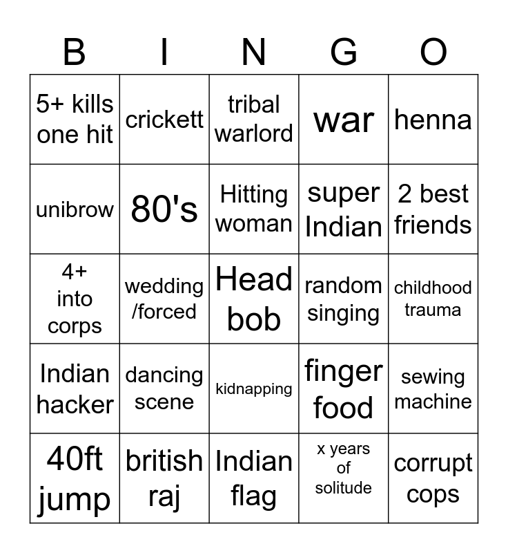 This bingo card has a free space and 24 words: dancing scene, british raj, Hitting woman, 40ft jump, henna, 5+ kills one hit, unibrow, crickett, random singing, kidnapping, super Indian, 4+ into corps, finger food, sewing machine, 80's, x years of solitude, childhood trauma, tribal warlord, 2 best friends, wedding /forced, corrupt cops, Indian hacker, war and Indian flag.