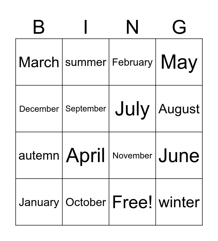 This bingo card has 17 words: Free!, January, February, March, April, May, June, July, August, September, October, November, December, summer, autemn, spring and winter.
