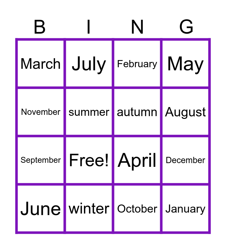 This bingo card has 18 words: Free!, January, February, March, April, May, June, July, August, September, October, November, December, summer, autumn, spring, winter and fall.