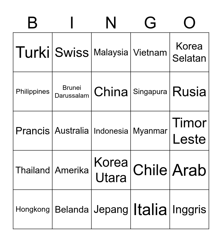 This bingo card has a free space and 24 words: Amerika, Belanda, China, Hongkong, Korea Selatan, Turki, Philippines, Swiss, Myanmar, Korea Utara, Singapura, Prancis, Chile, Arab, Brunei Darussalam, Italia, Timor Leste, Malaysia, Rusia, Australia, Inggris, Thailand, Vietnam and Jepang.