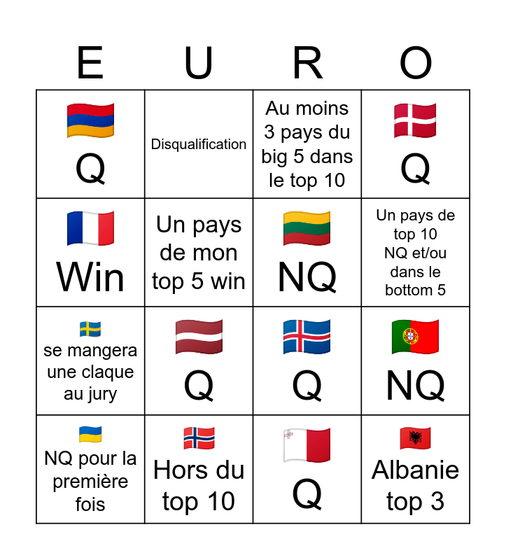 This bingo card has 16 words: ๐ณ๐ด Hors du top 10, ๐ต๐น NQ, Au moins 3 pays du big 5 dans le top 10, ๐ฆ๐ฒ Q, ๐ธ๐ช se mangera une claque au jury, Disqualification, ๐ฎ๐ธ Q, ๐ฒ๐น Q, ๐ซ๐ท Win, Un pays de mon top 5 win, ๐บ๐ฆ NQ pour la premiรจre fois, ๐ฉ๐ฐ Q, ๐ฑ๐ป Q, Un pays de top 10 NQ et/ou dans le bottom 5, ๐ฑ๐น NQ and ๐ฆ๐ฑ Albanie top 3.