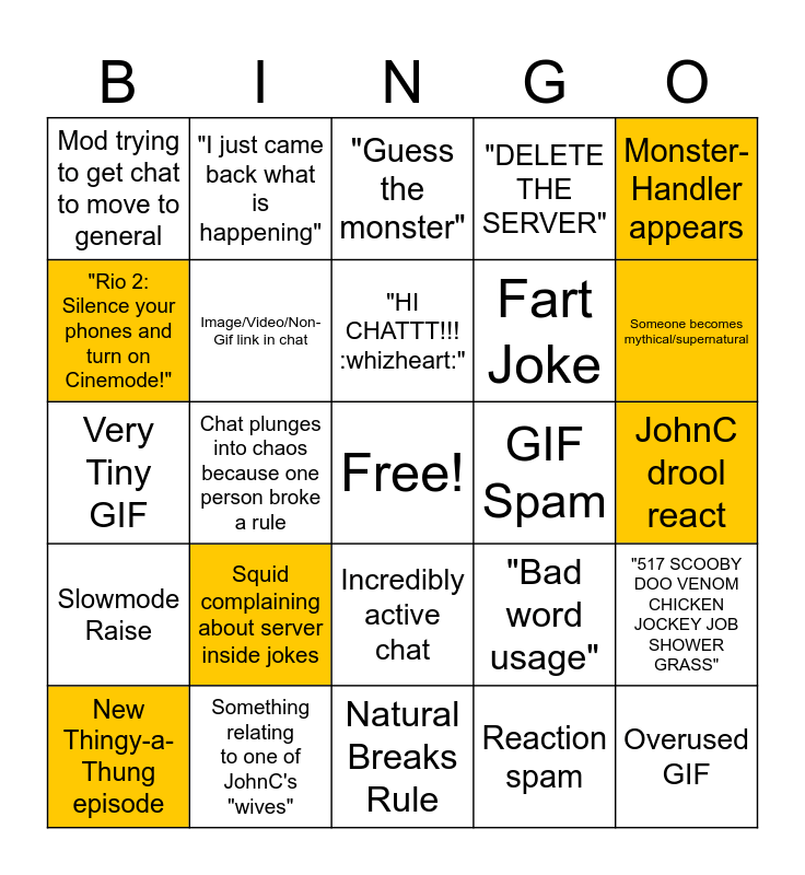 This bingo card has 1 images, a free space and 45 words: People being wholesome, Overused GIF, Someone trying to talk in Monsterpieces, Natural Breaks Rule, Squid complaining about server inside jokes, Absurdly difficult weekly challenge, "I just came back what is happening", MH/Entbrat Security ping/fake ping, "Rio 2: Silence your phones and turn on Cinemode!", ANOTHER LABER PIN, Image/Video/Non-Gif link in chat, "DELETE THE SERVER", "517 SCOOBY DOO VENOM CHICKEN JOCKEY JOB SHOWER GRASS", "Bad word usage", "I play it.", "HI CHATTT!!! :whizheart:", GIF Spam, Funny Member Catchphrase, Monster-Handler appears, Chat plunges into chaos because one person broke a rule, Reaction spam, Mod trying to get chat to move to general, Fart Joke, "Please read #server-rules before you chat", Someone becomes mythical/supernatural, New Thingy-a-Thung episode, "Dead chat", Incredibly active chat, Slowmode Raise, Slowmode Decrease, Someone intentionally messing up count in #counting, Treb trying to change the subject in chat, "Pretend this message breaks every rule", Swear Bypass, Something relating to one of JohnC's "wives", JohnC drool react, Innapropriate Reaction, Migrating to chat2/general because chat1 is too chaotic, JohnC hating on fandoms for no reason, "My top 5 favourite monsters", "Guess the monster", Very Tiny GIF, Mention of X'rt, Mention of Buzzinga and People commiting heinous crimes to get extra bingo tiles.