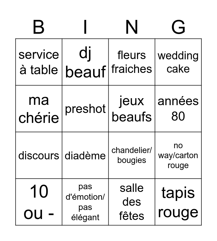 This bingo card has 16 words: pas d'émotion/ pas élégant, no way/carton rouge, fleurs fraiches, service à table, discours, dj beauf, chandelier/ bougies, salle des fêtes, ma chérie, preshot, 10 ou -, wedding cake, diadème, années 80, jeux beaufs and tapis rouge.