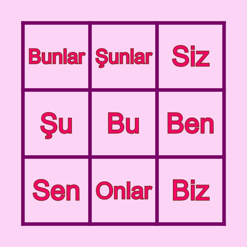 This bingo card has a free space and 8 words: Ben, Siz, Şunlar, Sen, Bunlar, Biz, Şu and Onlar.