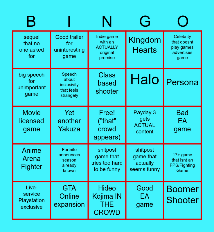 This bingo card has a free space and 24 words: Fortnite announces season already known, GTA Online expansion, Class based shooter, Live-service Playstation exclusive, Celebrity that doesnt play games advertises game, sequel that no one asked for, big speech for unimportant game, Good trailer for uninteresting game, Payday 3 gets ACTUAL content, shitpost game that tries too hard to be funny, Halo, Movie licensed game, shitpost game that actually seems funny, 17+ game that isnt an FPS/Fighting Game, Speech about inclusivity that feels strangely, Good EA game, Bad EA game, Indie game with an ACTUALLY original premise, Persona, Yet another Yakuza, Boomer Shooter, Anime Arena Fighter, Kingdom Hearts and Hideo Kojima IN THE CROWD.