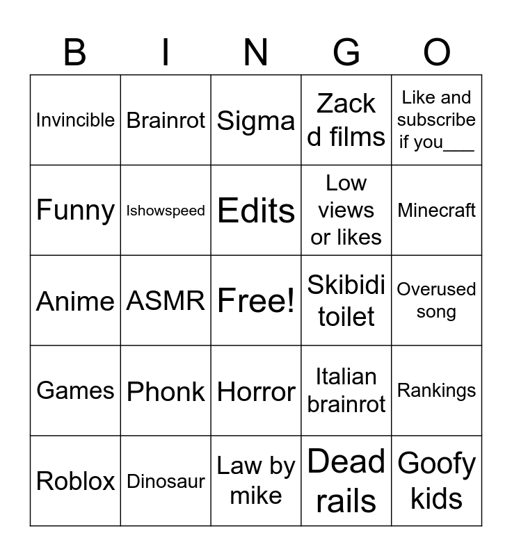 This bingo card has a free space and 24 words: Roblox, Phonk, Edits, Dead rails, Like and subscribe if you___, Invincible, Brainrot, Sigma, Skibidi toilet, Overused song, Anime, Ishowspeed, Italian brainrot, Rankings, Funny, Dinosaur, Law by mike, Zack d films, Minecraft, Games, ASMR, Horror, Low views or likes and Goofy kids.