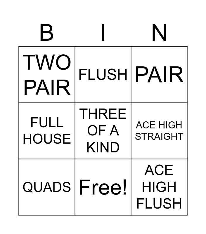 This bingo card has 10 words: Free!, PAIR, TWO PAIR, THREE OF A KIND, FULL HOUSE, QUADS, FLUSH, STRIAGHT, ACE HIGH STRAIGHT and ACE HIGH FLUSH.