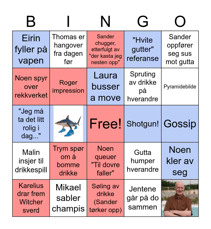 This bingo card has 2 images, a free space and 22 words: Trym spør om å bomme drikke, Mikael sabler champis, Laura busser a move, Karelius drar frem Witcher sverd, Sander oppfører seg sus mot gutta, Eirin fyller på vapen, Noen spyr over rekkverket, Thomas er hangover fra dagen før, Shotgun!, Noen queuer "Til dovre faller", Spruting av drikke på hverandre, "Jeg må ta det litt rolig i dag...", Gutta humper hverandre, Noen kler av seg, Roger impression, Jentene går på do sammen, Gossip, Sander chugger, etterfulgt av "der kasta jeg nesten opp", Pyramidebilde, Malin insjer til drikkespill, "Hvite gutter" referanse and Søling av drikke (Sander tørker opp).