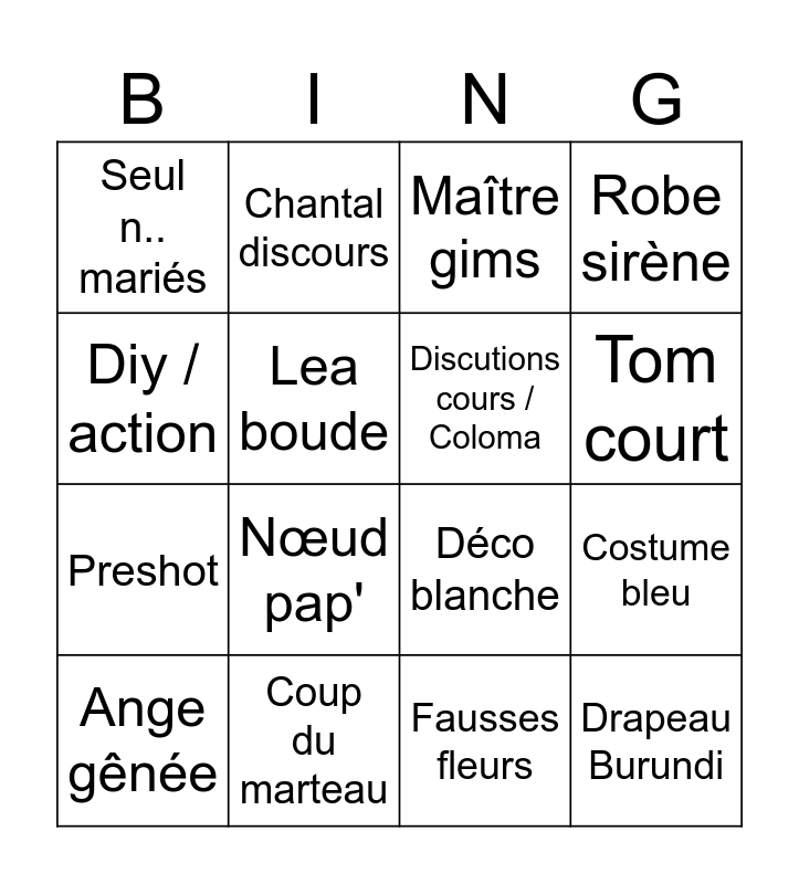 This bingo card has 16 words: Coup du marteau, Costume bleu, Maître gims, Seul n.. mariés, Preshot, Chantal discours, Déco blanche, Fausses fleurs, Diy / action, Lea boude, Ange gênée, Robe sirène, Nœud pap', Tom court, Discutions cours / Coloma and Drapeau Burundi.