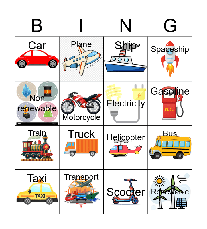 This bingo card has 16 images and 16 words: Transport, Bus, Ship, Car, Train, Plane, Helicopter, Scooter, Non renewable, Motorcycle, Taxi, Spaceship, Truck, Gasoline, Electricity and Renewable.