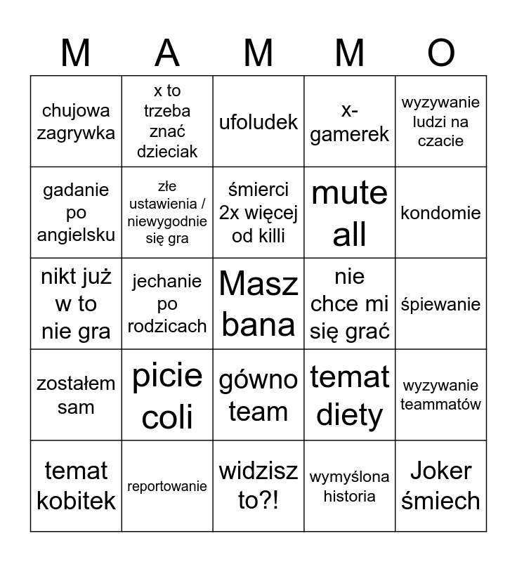 This bingo card has a free space and 44 words: dziwny taniec, Joker śmiech, rozumiesz?, temat kobitek, temat gówna, wymyślona historia, ufoludek, snajpienie, wyzywanie ludzi na czacie, reportowanie, x-gamerek, nie chce mi się grać, gówno team, picie coli, zjadłbym coś, widzisz to?!, krzyczenie/ dziwne dzwieki, nikt już w to nie gra, "bez honoru", kondomie, x to trzeba znać dzieciak, pyk pyk pyk, zamykanie tabeli, chujowa zagrywka, ff, śpiewanie, ogranicze / wyłączę ten czat, simp, temat diety, zostałem sam, "ludzik", wyzywanie teammatów, za moich czasów to, brak pieniędzy, jechanie po rodzicach, ja nie lubię alkoholu, stoi i banuje ludzi, tego gościa kojarzę, śmierci 2x więcej od killi, gadanie po angielsku, mute all, tłumaczenie, złe ustawienia / niewygodnie się gra and bez kitu.