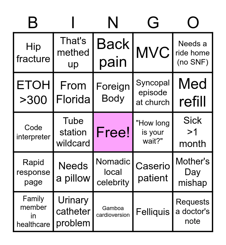 This bingo card has a free space and 24 words: Needs a pillow, Urinary catheter problem, Foreign Body, Family member in healthcare, Needs a ride home (no SNF), Hip fracture, ETOH >300, That's methed up, "How long is your wait?", Nomadic local celebrity, Syncopal episode at church, Code interpreter, Caserio patient, Mother's Day mishap, From Florida, Felliquis, Sick >1 month, Back pain, Med refill, Tube station wildcard, Requests a doctor's note, Rapid response page, MVC and Gamboa cardioversion.