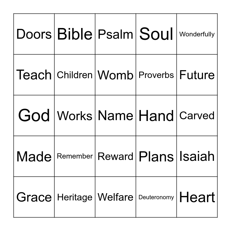 This bingo card has 40 words: Mother, God, Gift, Children, Heritage, Reward, Womb, Fearfully, Wonderfully, Made, Works, Soul, Name, Carved, Hand, Remember, Breaks, Doors, Forget, Psalm, Isaiah, Deuteronomy, Proverbs, Teach, Kindness, Wisdom, Encourage, Build, Heart, Hope, Resurrection, Grace, Mercy, Plans, Future, Welfare, Jesus, Christ, Bible and Proverbs.
