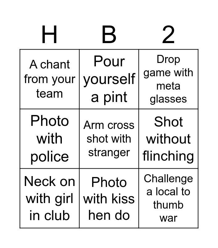 This bingo card has 9 words: Neck on with girl in club, Drop game with meta glasses, Pour yourself a pint, Photo with police, A chant from your team, Shot without flinching, Arm cross shot with stranger, Challenge a local to thumb war and Photo with kiss hen do.