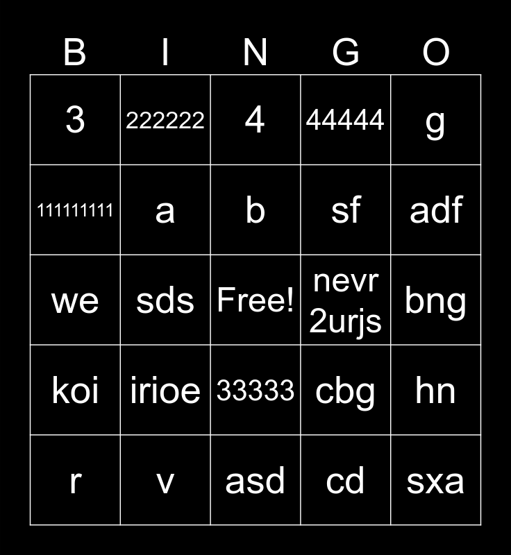 This bingo card has a free space and 29 words: a, v, 4, ffffff, g, 3, a, b, nevr 2urjs, hn, r, sds, cd, sxa, we, df, asd, cbg, adf, koi, irioe, w3t, sf, bng, 111111111, 222222, 33333, 44444 and 55555.