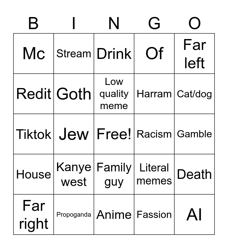 This bingo card has a free space and 24 words: Kanye west, Propoganda, Low quality meme, Far right, Far left, Mc, Redit, Stream, Racism, Family guy, Harram, Tiktok, Literal memes, Death, Goth, Fassion, Gamble, Drink, Cat/dog, Jew, AI, House, Of and Anime.