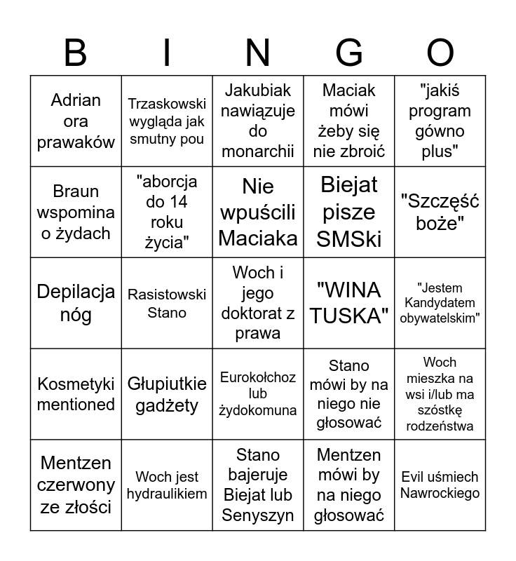 This bingo card has a free space and 24 words: Głupiutkie gadżety, Woch jest hydraulikiem, Nie wpuścili Maciaka, Mentzen czerwony ze złości, "jakiś program gówno plus", Adrian ora prawaków, Braun wspomina o żydach, Trzaskowski wygląda jak smutny pou, "WINA TUSKA", Eurokołchoz lub żydokomuna, Biejat pisze SMSki, Depilacja nóg, Stano mówi by na niego nie głosować, Woch mieszka na wsi i/lub ma szóstkę rodzeństwa, "aborcja do 14 roku życia", Mentzen mówi by na niego głosować, "Jestem Kandydatem obywatelskim", Jakubiak nawiązuje do monarchii, "Szczęść boże", Rasistowski Stano, Evil uśmiech Nawrockiego, Kosmetyki mentioned, Maciak mówi żeby się nie zbroić and Stano bajeruje Biejat lub Senyszyn.