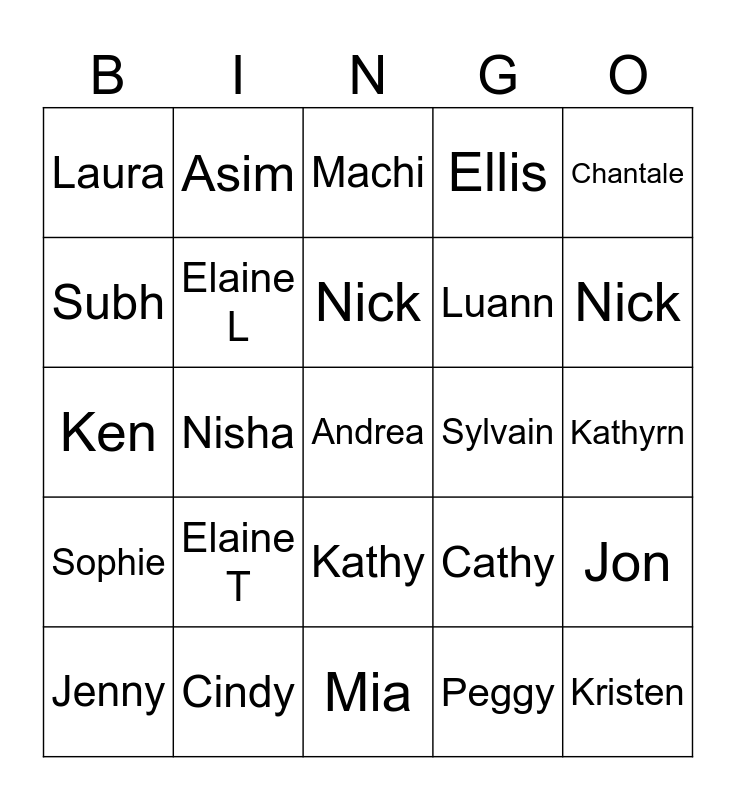 This bingo card has 29 words: Jenny, Steven, Nisha, Kristen, Laura, Machi, Elaine L, Elaine T, Sylvain, Cindy, Kathyrn, Andrea, Mia, Peggy, Nick, Zobair, Kathy, Sophie, Chantale, Ken, Cathy, Caitlin, Luann, Subh, Ellis, Asim, Jon, Nick and Isra.