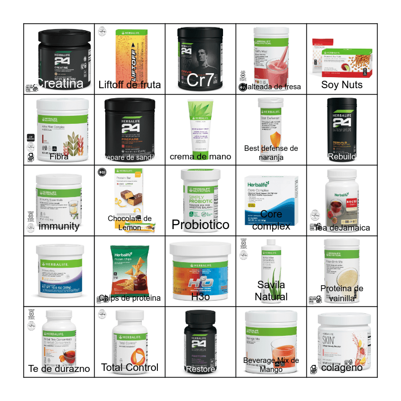 This bingo card has 25 images and 24 words: Total Control, Probiotico, Beverage Mix de Mango, Soy Nuts, Creatina, Liftoff de fruta, Cr7, Core complex, Proteina de vainilla, Fibra, Prepare de sandilla, Restore, Savila Natural, Rebuild, Te de durazno, Chocolate de Lemon, crema de mano, Best defense de naranja, Tea deJamaica, immunity, Chips de proteina, H3o, Malteada de fresa and colageno.