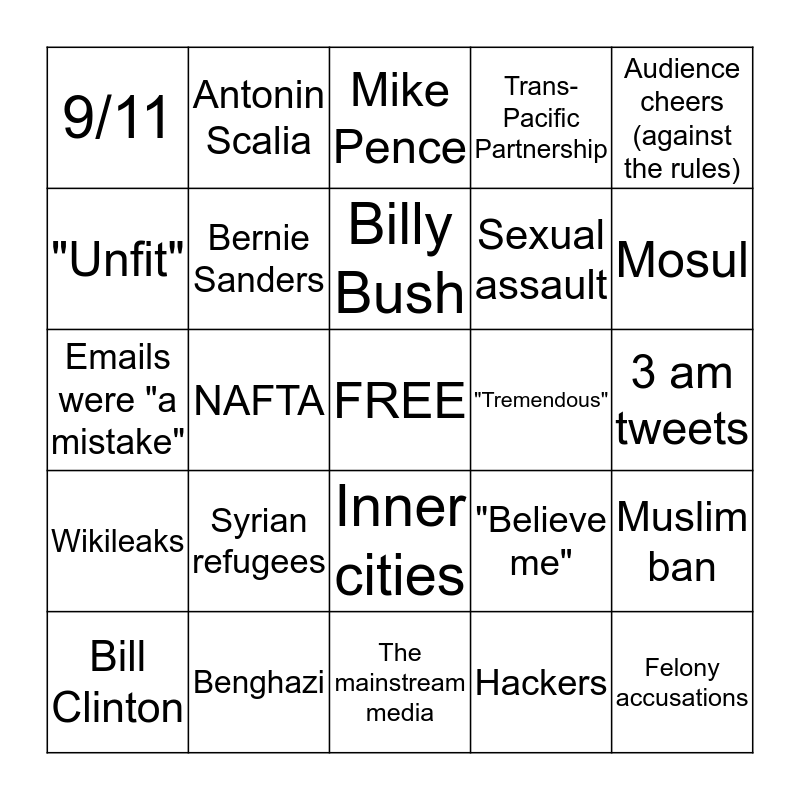 This bingo card has a free space and 33 words: "Yuge", The Wall, NAFTA, The secret plan to defeat ISIS, Wikileaks, Bernie Sanders, Audience cheers (against the rules), Bill Clinton, Antonin Scalia, Vladimir Putin, Billy Bush, Mike Pence, "Rigged", Clinton Foundation, "Tremendous", Mosul, Benghazi, Emails were "a mistake", Syrian refugees, "Believe me", Inner cities, Basket of deplorables, 9/11, 3 am tweets, The mainstream media, Felony accusations, Trans-Pacific Partnership, Sexual assault, "Unfit", Muslim ban, Radical Islamic terrorism, Hackers and Small business.