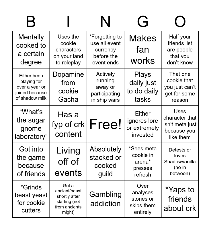 This bingo card has a free space and 24 words: Living off of events, Got a ancient/beast shortly after starting (not from ancients might), Actively running away or participating in ship wars, *Grinds beast yeast for cookie cutters, Half your friends list are people that you don’t know, Mentally cooked to a certain degree, Either been playing for over a year or joined because of shadow milk, Uses the cookie characters on your land to roleplay, Either ignores lore or extremely invested, Absolutely stacked or cooked guild, Plays daily just to do daily tasks, “What’s the sugar gnome laboratory”, *Sees meta cookie in arena* presses refresh, Detests or loves Shadowvanilla (no in between), Dopamine from cookie Gacha, Over analyses stories or skips them entirely, Uses character that isn’t meta just because you like them, *Forgetting to use all event currency before the event ends, That one cookie that you just can’t get for some reason, Has a fyp of crk content, *Yaps to friends about crk, Got into the game because of friends, Makes fan works and Gambling addiction.