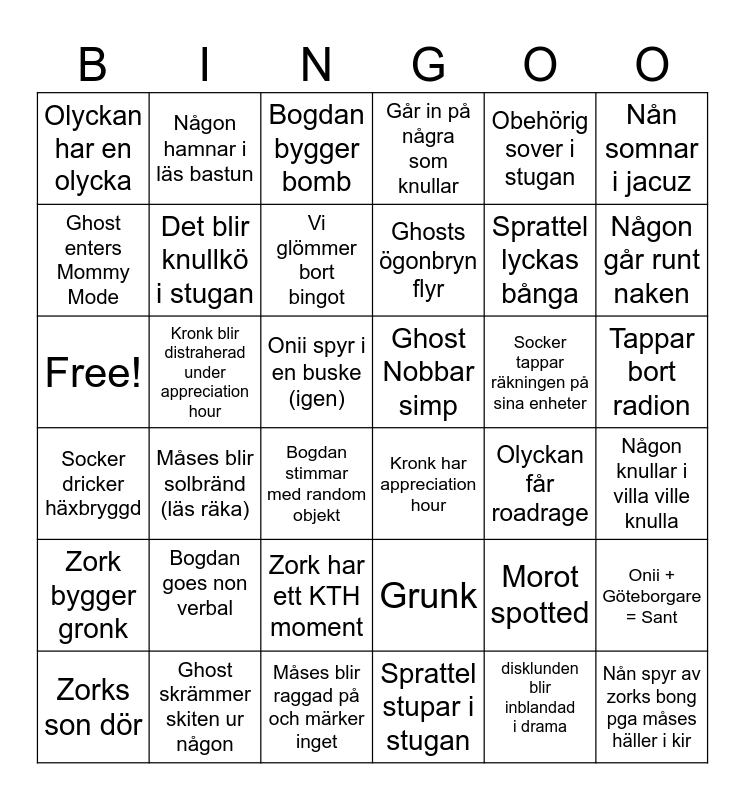 This bingo card has 36 words: Grunk, Zork har ett KTH moment, Sprattel stupar i stugan, Ghost enters Mommy Mode, Socker dricker häxbryggd, Ghost Nobbar simp, Det blir knullkö i stugan, Måses blir raggad på och märker inget, Obehörig sover i stugan, Morot spotted, Någon går runt naken, Går in på några som knullar, Onii + Göteborgare = Sant, Kronk blir distraherad under appreciation hour, Ghosts ögonbryn flyr, Olyckan har en olycka, Zork bygger gronk, Socker tappar räkningen på sina enheter, Free!, Bogdan bygger bomb, Onii spyr i en buske (igen), Måses blir solbränd (läs räka), Kronk har appreciation hour, Bogdan stimmar med random objekt, Olyckan får roadrage, Någon hamnar i läs bastun, Sprattel lyckas bånga, Ghost skrämmer skiten ur någon, Vi glömmer bort bingot, Nån somnar i jacuz, Nån spyr av zorks bong pga måses häller i kir, Zorks son dör, Någon knullar i villa ville knulla, Tappar bort radion, Bogdan goes non verbal and disklunden blir inblandad i drama.