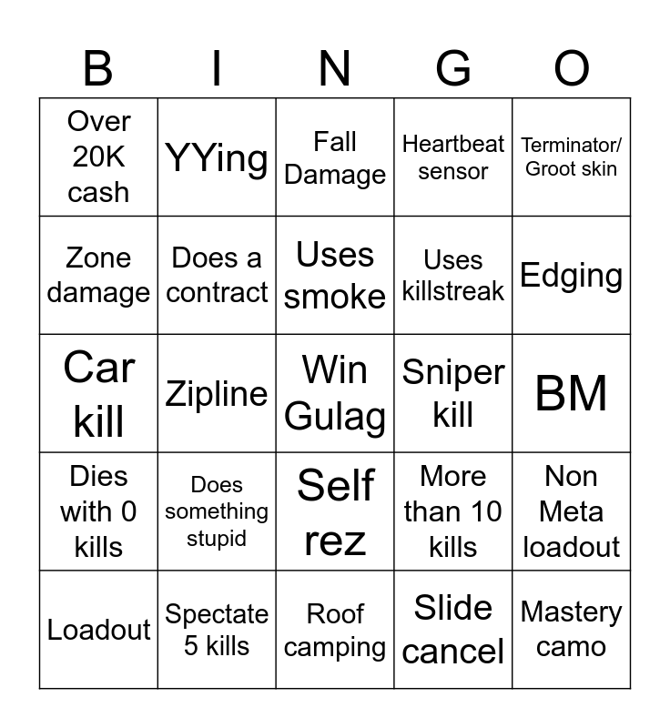This bingo card has a free space and 24 words: Does something stupid, Spectate 5 kills, Uses smoke, Loadout, Terminator/ Groot skin, Over 20K cash, Zone damage, YYing, Sniper kill, Self rez, Uses killstreak, Car kill, More than 10 kills, Non Meta loadout, Does a contract, Slide cancel, BM, Fall Damage, Edging, Zipline, Mastery camo, Dies with 0 kills, Heartbeat sensor and Roof camping.