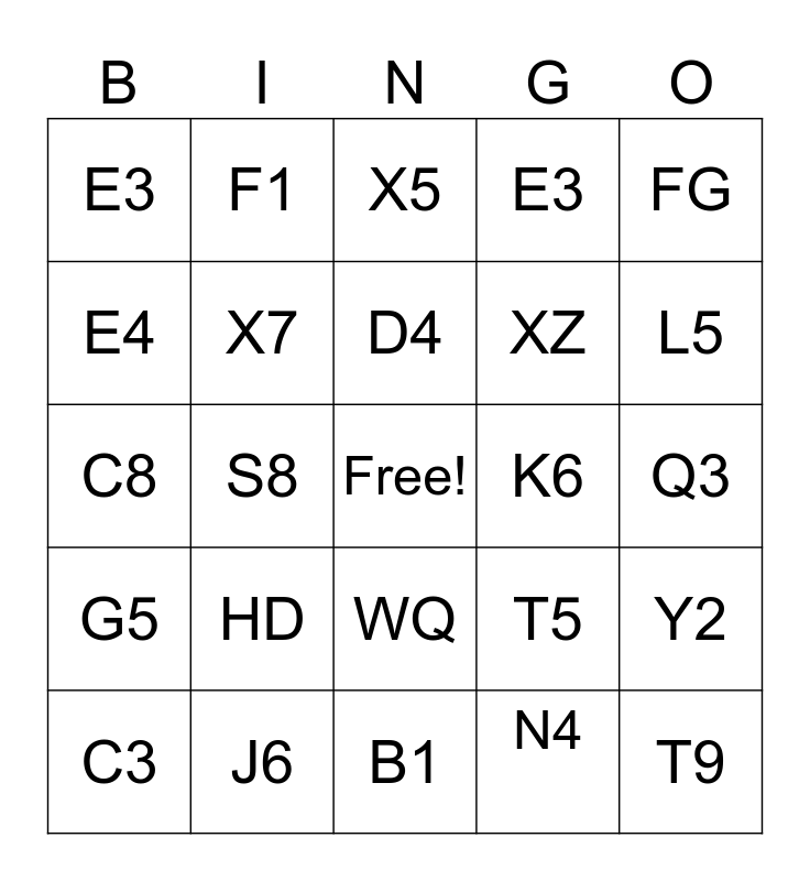 This bingo card has a free space and 25 words: HD, B1, D4, C3, FG, E3, E4, F1, K6, WQ, XZ, C8, T5, Y2, X7, M1, Q3, X5, L5, S8, T9, J6, G5, E3 and N4.