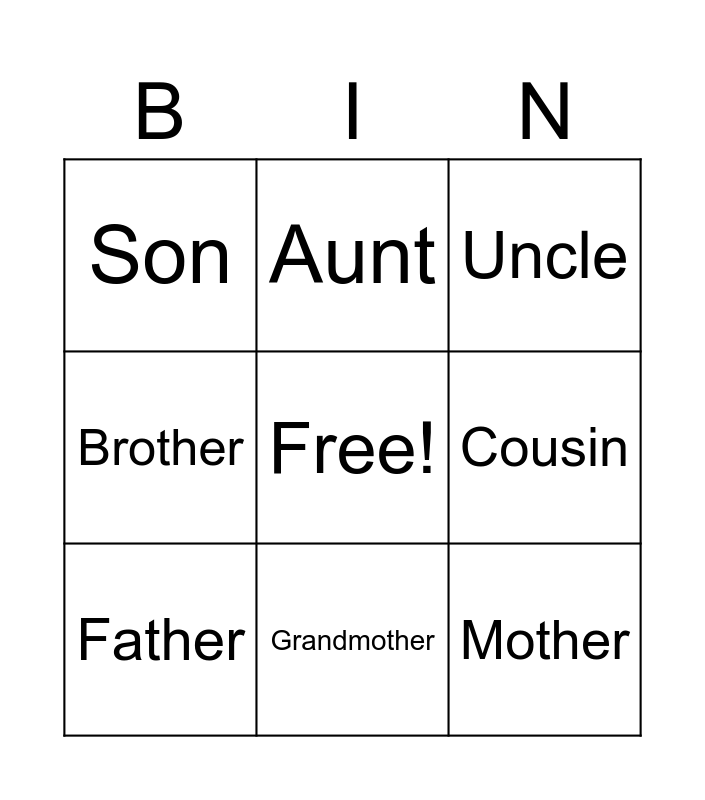 This bingo card has a free space and 11 words: Grandfather, Grandmother, Mother, Father, Aunt, Uncle, Cousin, Sister, Brother, Son and Daughter.
