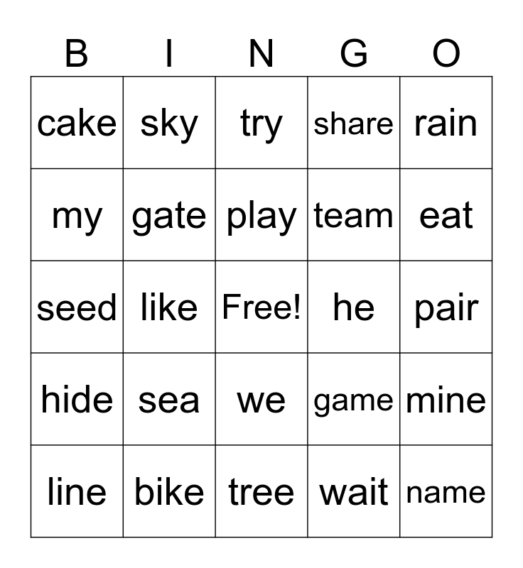 This bingo card has a free space and 24 words: sea, bike, play, line, rain, cake, my, sky, he, we, team, seed, game, mine, gate, wait, pair, try, eat, like, name, hide, share and tree.