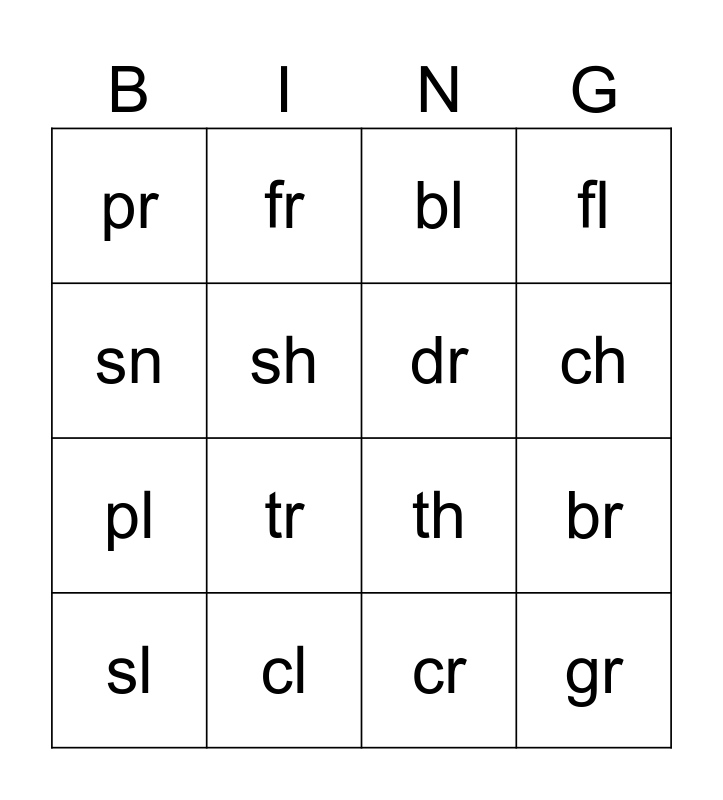 This bingo card has 17 words: sl, cl, bl, fl, pl, sh, th, ch, sn, tr, cr, br, pr, fr, dr, gr and sn.