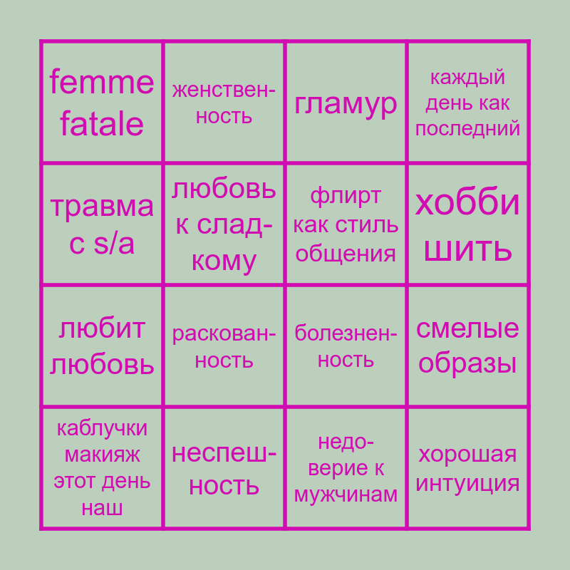 This bingo card has 16 words: неспеш-ность, смелые образы, гламур, femme fatale, любит любовь, женствен-ность, болезнен-ность, недо-верие к мужчинам, травма с s/a, любовь к слад-кому, каблучки макияж этот день наш, каждый день как последний, раскован-ность, хобби шить, флирт как стиль общения and хорошая интуиция.