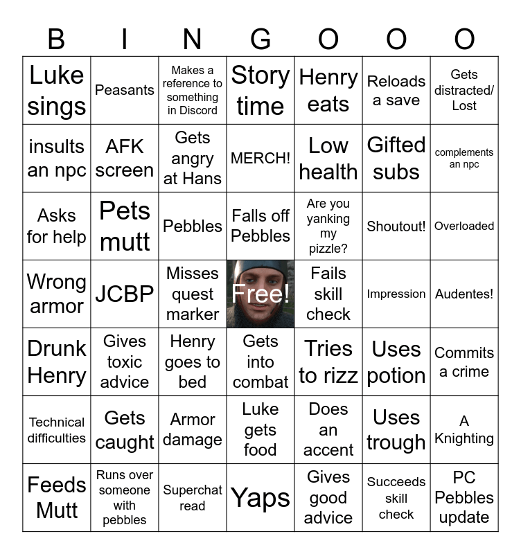 This bingo card has a free space and 48 words: Does an accent, Gifted subs, Yaps, JCBP, Pebbles, Audentes!, Peasants, Runs over someone with pebbles, Reloads a save, Gets into combat, Gets distracted/ Lost, Story time, Shoutout!, Are you yanking my pizzle?, Technical difficulties, Impression, insults an npc, complements an npc, Uses trough, Henry eats, Low health, Misses quest marker, Luke sings, AFK screen, A Knighting, Gets angry at Hans, Overloaded, Feeds Mutt, Falls off Pebbles, Pets mutt, Succeeds skill check, Fails skill check, Commits a crime, Gets caught, Wrong armor, Tries to rizz, Uses potion, Asks for help, Henry goes to bed, Armor damage, Drunk Henry, PC Pebbles update, Makes a reference to something in Discord, Superchat read, MERCH!, Luke gets food, Gives toxic advice and Gives good advice.
