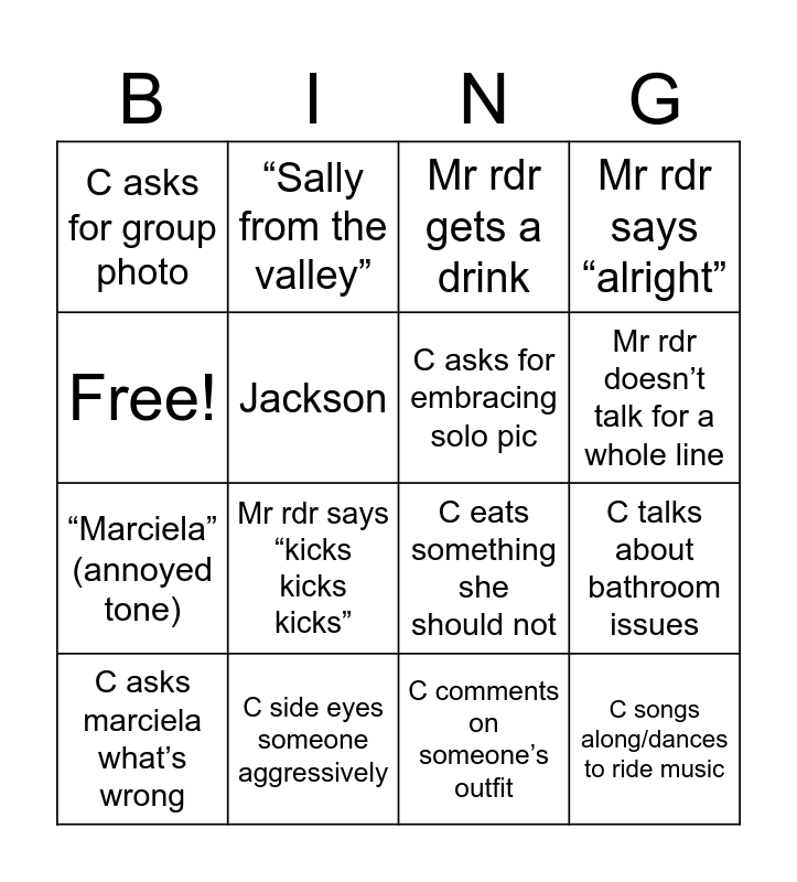This bingo card has 16 words: C side eyes someone aggressively, C talks about bathroom issues, Mr rdr gets a drink, C asks for group photo, “Marciela” (annoyed tone), “Sally from the valley”, C eats something she should not, C comments on someone’s outfit, Free!, Jackson, C asks marciela what’s wrong, Mr rdr says “alright”, Mr rdr says “kicks kicks kicks”, Mr rdr doesn’t talk for a whole line, C asks for embracing solo pic and C songs along/dances to ride music.