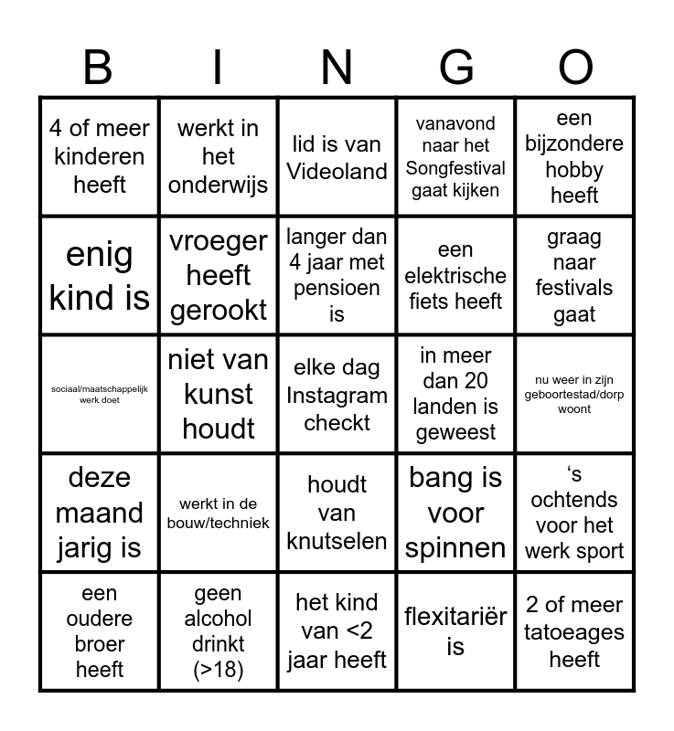 This bingo card has 98 words: Free!, Zoek iemand die.., langer dan een half jaar in het buitenland heeft gewoond, nu weer in zijn geboortestad/dorp woont, een relatie heeft met zijn/haar eerste liefde, samenwoont maar niet is getrouwd, minimaal 20 jaar is getrouwd, heel erg verliefd is, niet van chocola houdt, hockey speelt, een eigen bedrijf met werknemers heeft, werkt met dieren, werkt in de zorg, werkt in de bouw/techniek, werkt in de culturele sector, werkt in het onderwijs, sociaal/maatschappelijk werk doet, ZZP-er is, werkt met asielzoekers, dit jaar met pensioen gaat of is gegaan, beroepssporter is (geweest), een lintje heeft gekregen, een hond heeft, een huisdier heeft dat geen hond of kat is, een kat heeft, 4 of meer kinderen heeft, het kind van <2 jaar heeft, twee of meer zussen heeft, meer dan 7 kleinkinderen heeft, twee of meer broers heeft, een oudere broer heeft, enig kind is, een multiculturele relatie heeft, een bijzondere verzameling heeft, graag naar festivals gaat, 2 of meer tatoeages heeft, vanavond naar het Songfestival gaat kijken, schoenen met veters draagt, niet van kunst houdt, geen piano in huis heeft staan, 50 is en geen bril/lenzen draagt (los van leesbril), langer dan 4 jaar met pensioen is, een elektrische fiets heeft, graag naar de sportschool gaat, aan yoga doet, houdt van knutselen, aan hardlopen doet, fanatiek voetbalsupporter is, een teamsport beoefent, schoenmaat 38 heeft, haar haren vaak verft, groene ogen heeft, schoenmaat 44 heeft, (bijna) altijd lippenstift op heeft, een baard heeft, een piercing heeft (gehad), deze maand jarig is, in oktober jarig is, in april jarig is, in december jarig is, in het buitenland is geboren, de radslag kan, de handstand kan, een koprol kan maken, linkshandig of linksbenig is, 5 of meer talen spreekt, mooi kan zingen, geen muziekinstrument bespeelt, houdt van bordspelletjes, Boer Zoekt Vrouw kijkt, lid is van Videoland, politiek actief is (geweest), flexitariër is, vliegschaamte heeft, Veganistisch of vegetarisch is, een allergie heeft, graag nieuwe recepten uitprobeert, houdt van bakken, een account heeft op Vinted, elke dag Instagram checkt, een telefoonverslaving heeft, vroeger heeft gerookt, geen alcohol drinkt (>18), geen social media accounts heeft, elke avond het journaal kijkt, dagelijks een tablet gebruikt, een e-reader verkiest boven een papieren boek, elke avond in bed leest, ‘s ochtends voor het werk sport, vaker met de trein reist dan met de auto, op de fiets naar het werk gaat, bang is voor spinnen, vaker dan 2 keer naar de Efteling is geweest, elk jaar kampeert, in meer dan 20 landen is geweest, een boek heeft geschreven, een bijzondere hobby heeft and fanatiek carnaval viert.