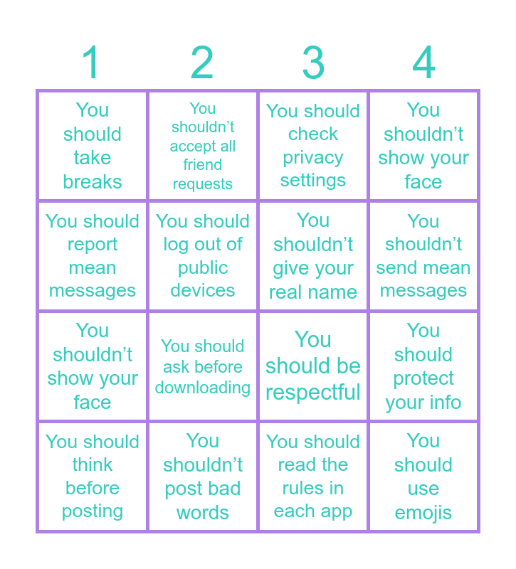 This bingo card has 20 words: You should protect your info, You shouldn’t click on strange links, You should check privacy settings, You shouldn’t share your password, You should think before posting, You should report mean messages, You shouldn’t post bad words, You should take breaks, You shouldn’t show your face, You shouldn’t accept all friend requests, You should ask before downloading, You should be respectful, You should log out of public devices, You should use emojis, You shouldn’t give your real name, You should ask before downloading, You shouldn’t send mean messages, You shouldn’t show your face, You should read the rules in each app and You shouldn’t believe everything online.