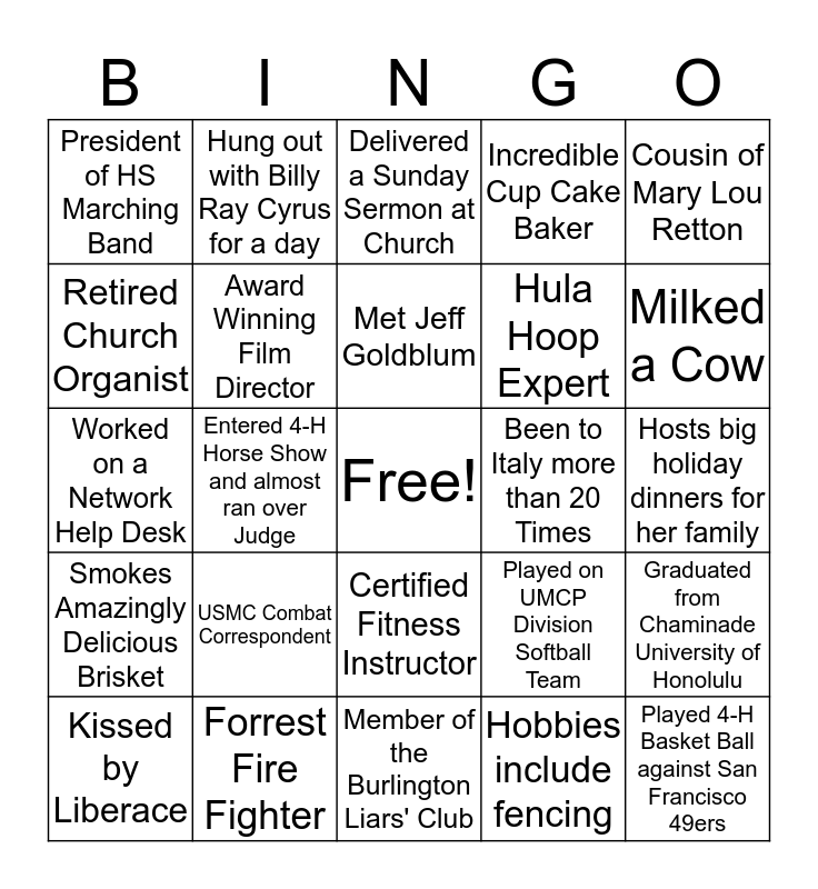 This bingo card has a free space and 24 words: USMC Combat Correspondent, Forrest Fire Fighter, Met Jeff Goldblum, Kissed by Liberace, Cousin of Mary Lou Retton, President of HS Marching Band, Retired Church Organist, Hung out with Billy Ray Cyrus for a day, Been to Italy more than 20 Times, Certified Fitness Instructor, Hula Hoop Expert, Worked on a Network Help Desk, Played on UMCP Division Softball Team, Graduated from Chaminade University of Honolulu, Award Winning Film Director, Hobbies include fencing, Hosts big holiday dinners for her family, Delivered a Sunday Sermon at Church, Milked a Cow, Entered 4-H Horse Show and almost ran over Judge, Played 4-H Basket Ball against San Francisco 49ers, Smokes Amazingly Delicious Brisket, Incredible Cup Cake Baker and Member of the Burlington Liars' Club.