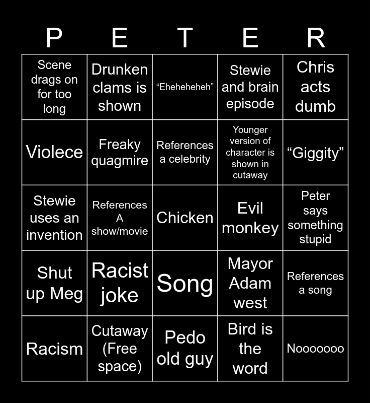 This bingo card has 28 words: References a song, Stewie insults Brian, Younger version of character is shown in cutaway, Bird is the word, Violece, “Eheheheheh”, Drunken clams is shown, Shut up Meg, Evil monkey, Racism, Stewie uses an invention, Stewie and brain episode, Cutaway (Free space), Pedo old guy, “Giggity”, Mort gets made fun of, Racist joke, Freaky quagmire, References a celebrity, Song, Scene drags on for too long, Nooooooo, Chicken, References A show/movie, Peter says something stupid, Mayor Adam west, Chris acts dumb and Peter acts dumb.