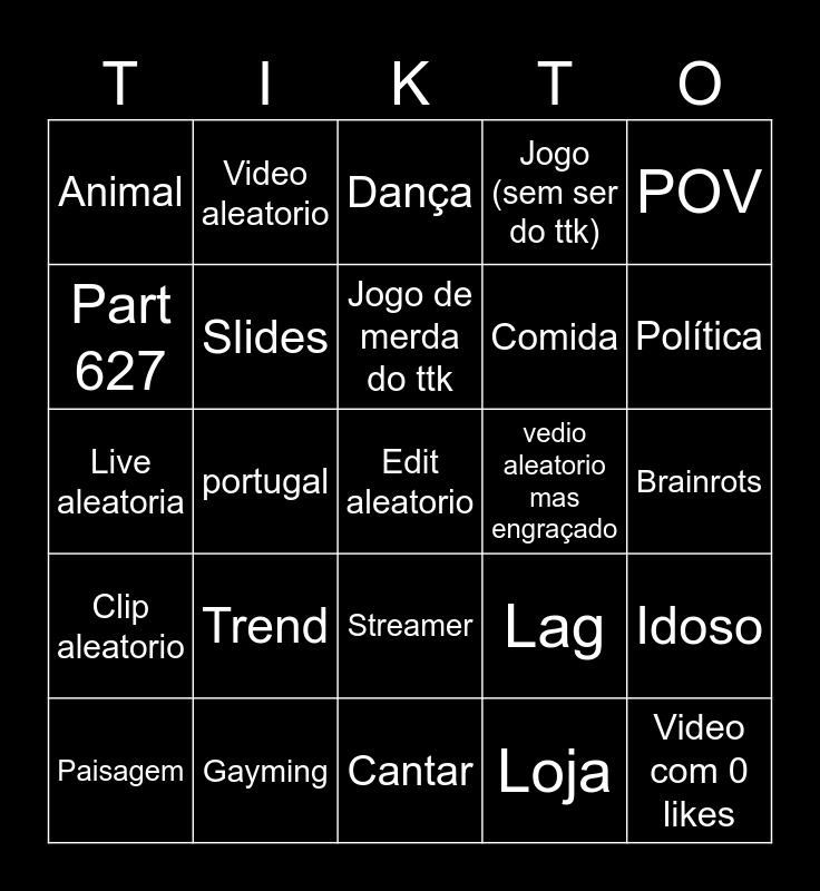 This bingo card has a free space and 24 words: Trend, Gayming, Jogo de merda do ttk, Paisagem, POV, Animal, Part 627, Video aleatorio, vedio aleatorio mas engraçado, Streamer, Comida, Live aleatoria, Lag, Idoso, Slides, Loja, Brainrots, Dança, Política, portugal, Video com 0 likes, Clip aleatorio, Jogo (sem ser do ttk) and Cantar.