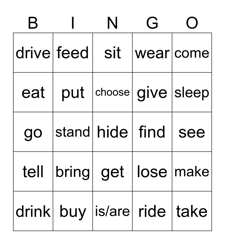 This bingo card has a free space and 24 words: bring, buy, choose, drink, come, drive, eat, feed, find, get, give, go, lose, make, put, ride, see, sit, sleep, stand, take, tell, wear and is/are.
