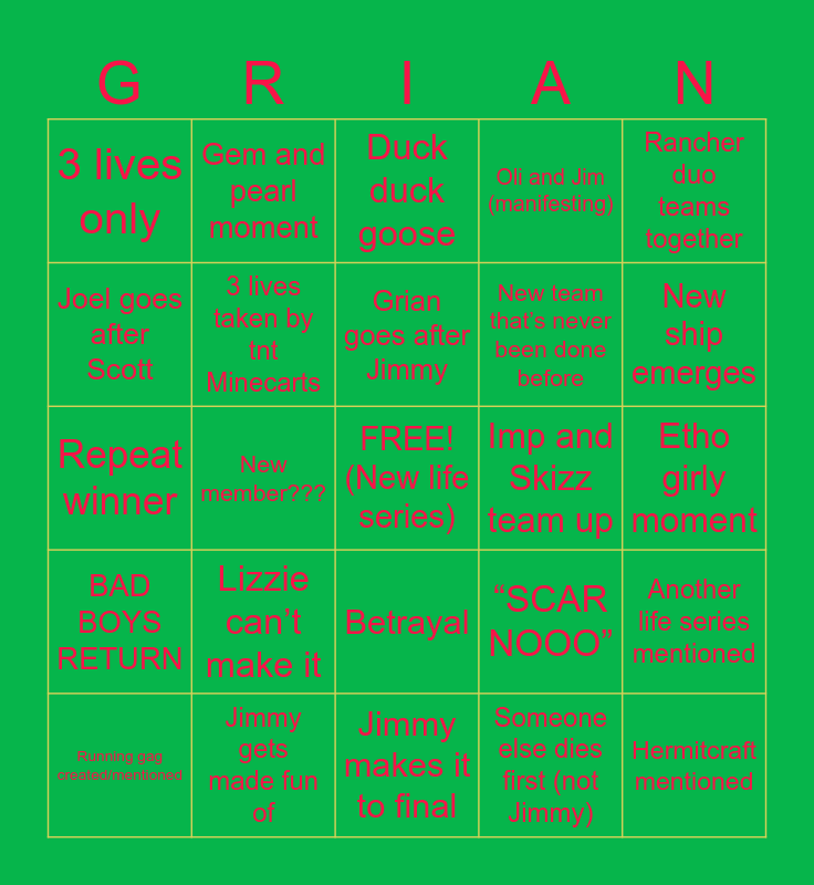 This bingo card has a free space and 24 words: Lizzie can’t make it, Jimmy gets made fun of, Grian goes after Jimmy, Running gag created/mentioned, Rancher duo teams together, 3 lives only, Joel goes after Scott, Gem and pearl moment, Imp and Skizz team up, Betrayal, New team that’s never been done before, Repeat winner, “SCAR NOOO”, Another life series mentioned, 3 lives taken by tnt Minecarts, Someone else dies first (not Jimmy), Etho girly moment, Duck duck goose, New ship emerges, New member???, Hermitcraft mentioned, BAD BOYS RETURN, Oli and Jim (manifesting) and Jimmy makes it to final.