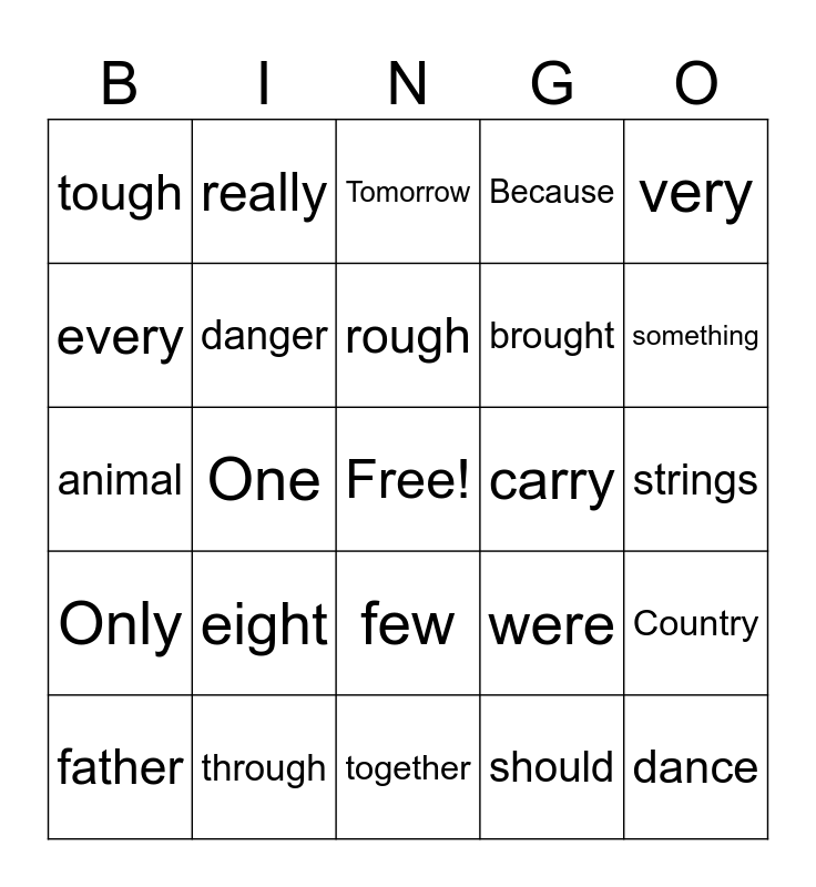 This bingo card has a free space and 24 words: eight, through, rough, father, very, tough, every, really, carry, few, brought, animal, were, Country, danger, should, strings, Tomorrow, something, One, dance, Only, Because and together.