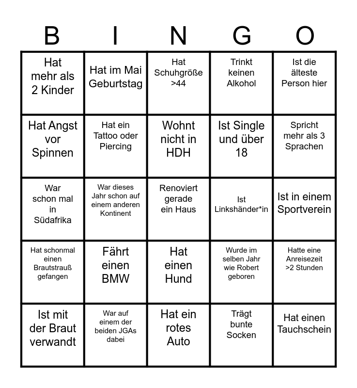This bingo card has 25 words: Fährt einen BMW, Hat ein rotes Auto, Wohnt nicht in HDH, Ist mit der Braut verwandt, Ist die älteste Person hier, Hat mehr als 2 Kinder, Hat Angst vor Spinnen, Hat im Mai Geburtstag, Ist Linkshänder*in, Hat einen Hund, Ist Single und über 18, War schon mal in Südafrika, Wurde im selben Jahr wie Robert geboren, Hatte eine Anreisezeit >2 Stunden, Hat ein Tattoo oder Piercing, Hat einen Tauchschein, Ist in einem Sportverein, Hat Schuhgröße >44, Spricht mehr als 3 Sprachen, War dieses Jahr schon auf einem anderen Kontinent, Renoviert gerade ein Haus, War auf einem der beiden JGAs dabei, Hat schonmal einen Brautstrauß gefangen, Trinkt keinen Alkohol and Trägt bunte Socken.