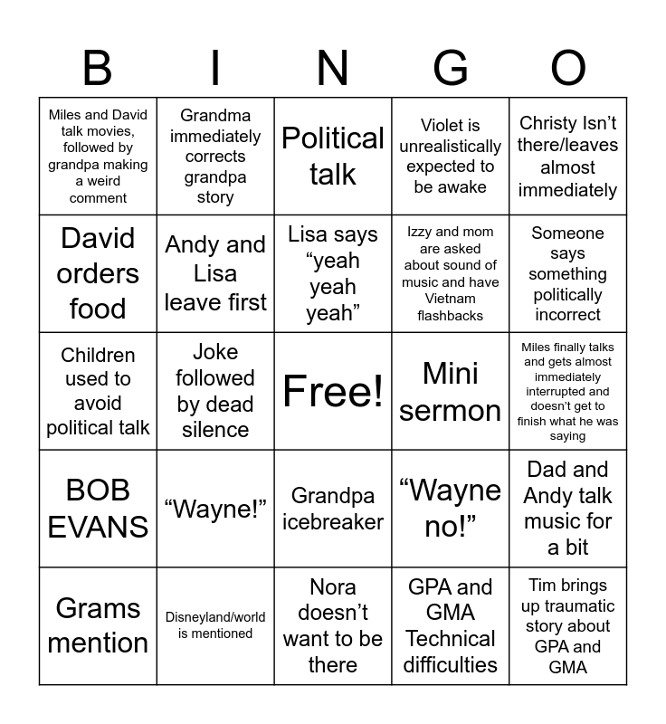 This bingo card has a free space and 24 words: “Wayne!”, Disneyland/world is mentioned, Lisa says “yeah yeah yeah”, Grams mention, Christy Isn’t there/leaves almost immediately, Miles and David talk movies, followed by grandpa making a weird comment, David orders food, Grandma immediately corrects grandpa story, Mini sermon, Grandpa icebreaker, Izzy and mom are asked about sound of music and have Vietnam flashbacks, Children used to avoid political talk, “Wayne no!”, Dad and Andy talk music for a bit, Andy and Lisa leave first, GPA and GMA Technical difficulties, Miles finally talks and gets almost immediately interrupted and doesn’t get to finish what he was saying, Political talk, Someone says something politically incorrect, Joke followed by dead silence, Tim brings up traumatic story about GPA and GMA, BOB EVANS, Violet is unrealistically expected to be awake and Nora doesn’t want to be there.