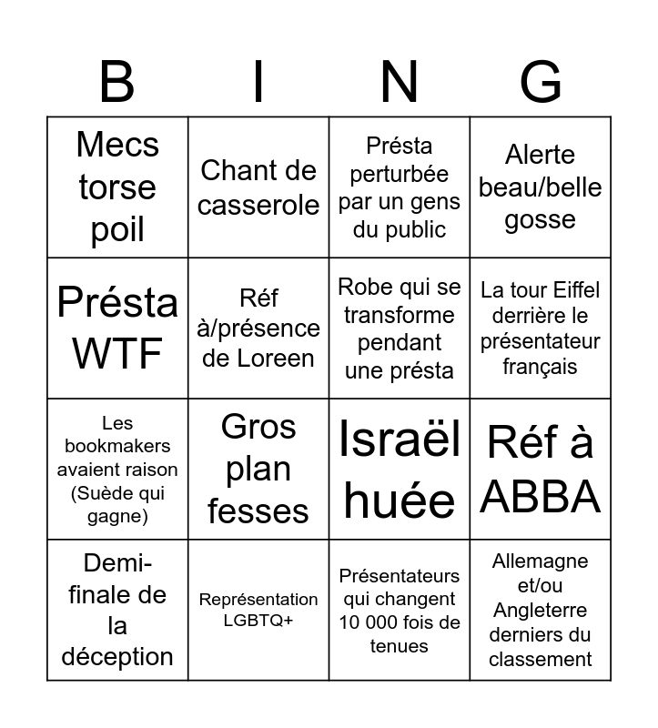 This bingo card has 16 words: Représentation LGBTQ+, Réf à ABBA, Présta perturbée par un gens du public, Mecs torse poil, Les bookmakers avaient raison (Suède qui gagne), Chant de casserole, Israël huée, Présentateurs qui changent 10 000 fois de tenues, Présta WTF, Réf à/présence de Loreen, Demi-finale de la déception, Alerte beau/belle gosse, Gros plan fesses, La tour Eiffel derrière le présentateur français, Robe qui se transforme pendant une présta and Allemagne et/ou Angleterre derniers du classement.
