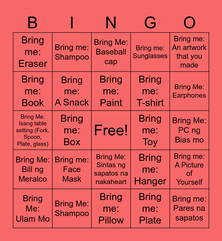 This bingo card has a free space and 49 words: Bring me: Frying Pan, Bring me: Pares na sapatos, Bring me: Rubbing Alcohol, Bring me: Pillow, Bring me: Face Mask, Bring me: Hanger, Bring me: Shampoo, Bring me: Paint Brush, Bring me: Book, Bring me: Yourself, Bring me: A Snack, Bring me: Sunglasses, Bring me: A Picture of Yourself, Bring me: Hanger, Bring me: Someone, Bring me: Soap, Bring me: Paint, Bring me: Toy, Bring me: Phone, Bring me: An artwork that you made, Bring me: Box, Bring me: Plate, Bring me: Eraser, Bring me: T-shirt, Bring Me: Tsinelas na Sira, Bring Me: Earphones, Bring Me: Ulam Mo, Bring Me: Picture na may nakasulat "VOTE WISELY", Bring Me: Sintas ng sapatos na nakaheart, Bring Me: Bill ng Meralco, Bring Me: Sunglasses, Bring Me: Laundry Clip, Bring Me: Electricfan, Bring Me: Chichirya, Bring Me: Shampoo, Bring Me: Book, Bring Me: Picture ng nunal, Bring Me: Hanger, Bring Me: PC ng Bias mo, Bring Me: Cellphone na hindi sa'yo, Bring Me: Payong na sira, Bring Me: Picture na Kumakain ka, Bring Me: Picture ng clouds, Bring Me: Picture ng Mansanas na drawing mo, Bring Me: Isang table setting (Fork, Spoon, Plate, glass), Bring Me: Baseball cap, Bring Me: ointment na paborito mo, Bring Me: dalawang bente pesos na coin and Bring Me: Black shirt na hindi related sa esbi.