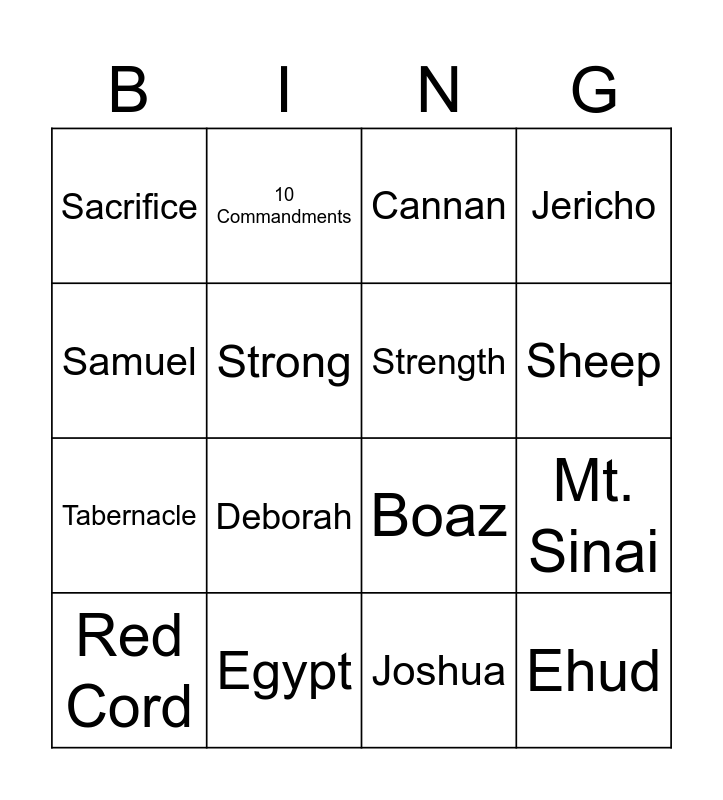 This bingo card has 16 words: Egypt, Mt. Sinai, Cannan, Sacrifice, Tabernacle, 10 Commandments, Boaz, Joshua, Samuel, Strong, Red Cord, Jericho, Deborah, Sheep, Strength and Ehud.