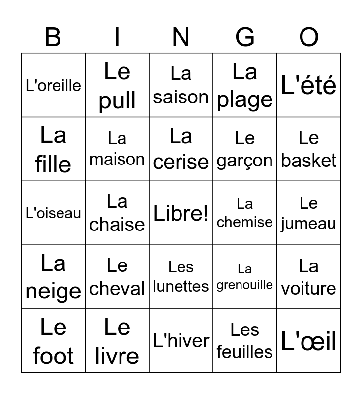 This bingo card has a free space and 24 words: Le foot, Le cheval, La cerise, Les feuilles, L'été, L'oreille, Le pull, La saison, La chemise, Le jumeau, L'oiseau, La maison, La grenouille, La voiture, La fille, Le livre, L'hiver, La plage, Le basket, La neige, La chaise, Les lunettes, Le garçon and L'œil.